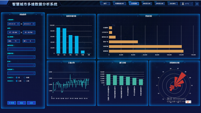 多维数据分析系统基于数据仓库、OLAP(联机分析技术)和数据挖掘技术,对系统内的问题从空间属性、问题类别等各个维度进行计算和分析,通过可视化技术一体化融合量化数据、电子地图、图表等多种信息,为用户提供多种比对、挖掘和分析城市管理运行数据的工具。